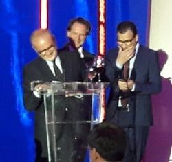 El profesor Ignacio Bilbao organizador del ECIO 2017 junto a Thomas Helmberger de Munich y Afshin Gangi de Estrasburgo dirigen unas divertidas e informales palabras durante la cena que CIRSE ofreció en el Museo Gugemheim.